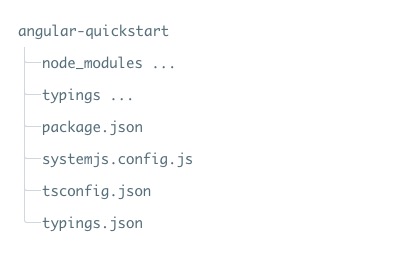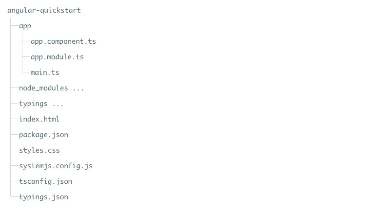 执行成功后,angular-quickstart 目录下就会生成一个 node_modules 目录,这里包含了我们这个实例需要的模块,我们可以看下项目的目录结构: