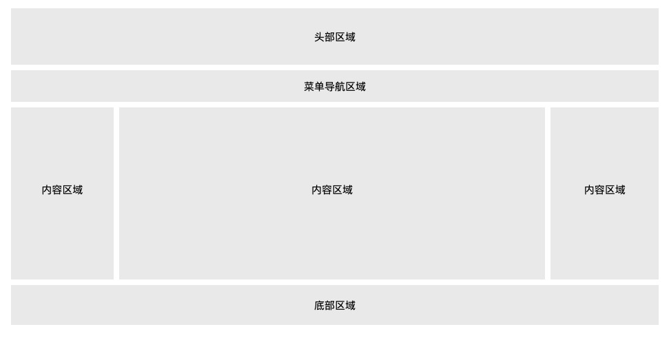 网页布局有很多种方式,一般分为以下几个部分:头部区域、菜单导航区域、内容区域、底部区域。