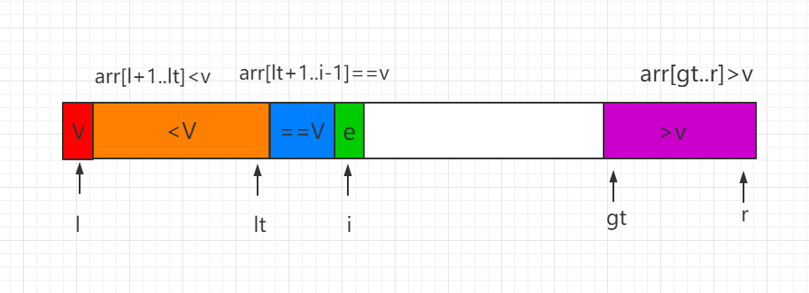(2)当前处理元素 e<v,e 和等于 V 区间的第一个位置数值进行交换,同时索引 lt 和 i 都向后移动一位