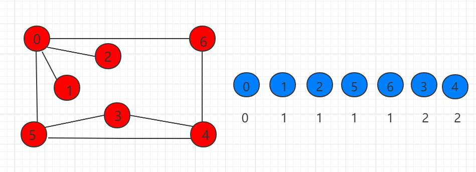 下图所示,右边蓝色表示从 0 开始遍历节点的顺序,下面是记录距离 0 的距离,可知广度优先遍历能求出无权图的最短路径。