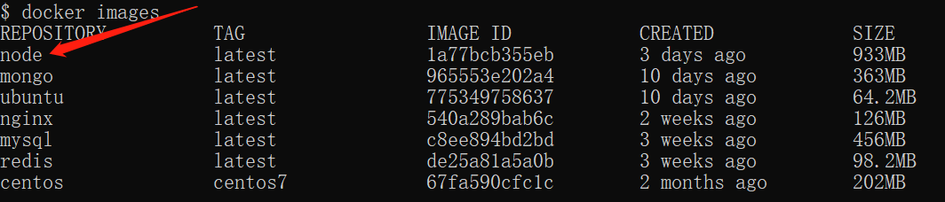 在上图中可以看到我们已经安装了最新版本(latest)的 node 镜像。
