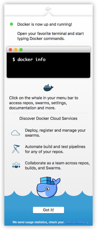在载入 Docker app 后,点击 Next,可能会询问你的 macOS 登陆密码,你输入即可。之后会弹出一个 Docker 运行的提示窗口,状态栏上也有有个小鲸鱼的图标(
