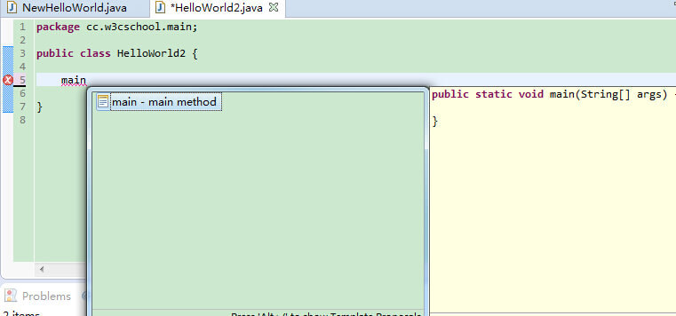 我们只需在类体中键入main,然后使用Eclipse的代码提示快捷键(默认为Alt+/),回车后,就可以看到Eclipse自动帮我们完成了main函数的完整定义: