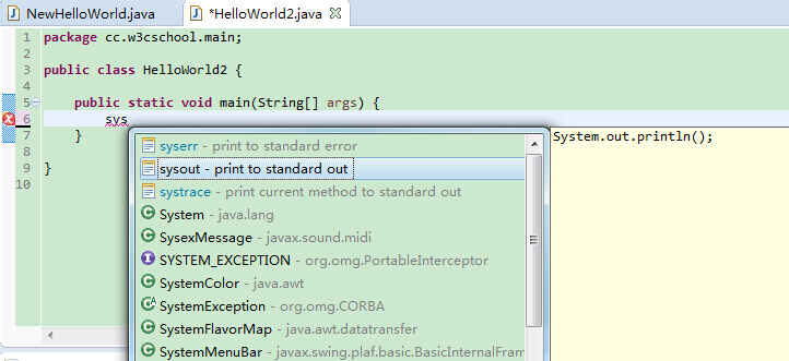 如果我们要使用 System.out.println(),我们只需要输入 syso 然后按下 Alt+/ 即可: