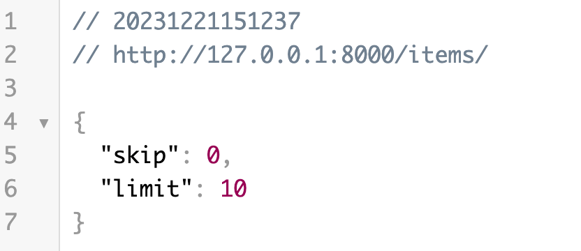 以下实例中我们定义了一个 /items/ 路由,接受两个查询参数 skip 和 limit,它们的类型均为整数,默认值分别为 0 和 10。