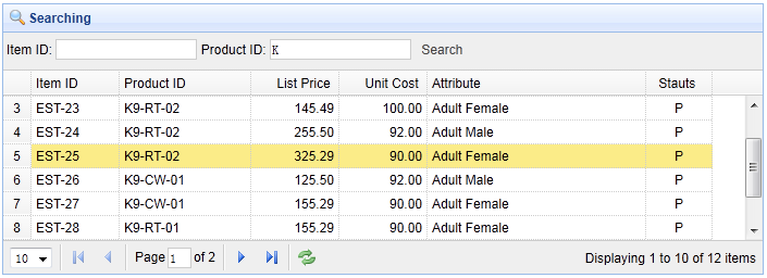 <div id="tb" style="padding:3px"> <span>Item ID:</span> <input id="itemid" style="line-height:26px;border:1px solid #ccc"> <span>Product ID:</span> <input id="productid" style="line-height:26px;border:1px solid #ccc"> <a href="#" class="easyui-linkbutton" plain="true" onclick="doSearch()">Search</a> </div>