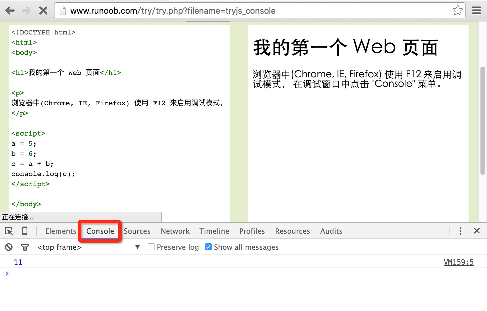 浏览器中使用 F12 来启用调试模式, 在调试窗口中点击 "Console" 菜单。