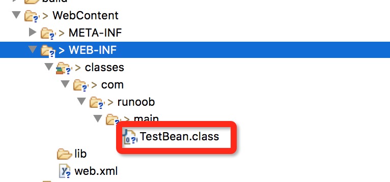 编译完成后会在当前目录下生成一个 TestBean.class 文件, 将该文件拷贝至当前 JSP 项目的 WebContent/WEB-INF/classes/com/yssmx/main 下( com/yssmx/main 包路径,没有需要手动创建)。