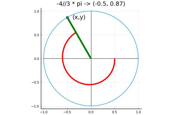 下图中以弧度为单位的角度对应于单位圆上的一个点,其坐标定义了角度的正弦和余弦。