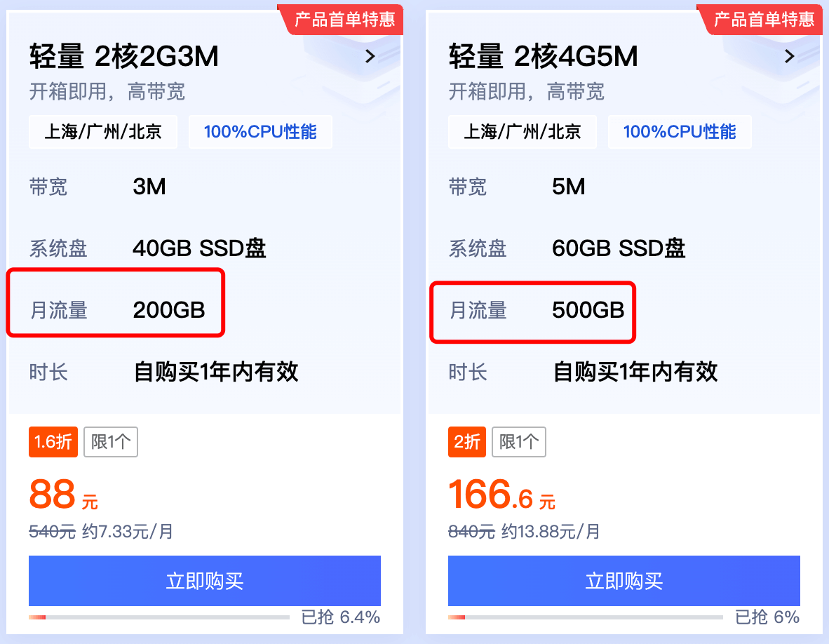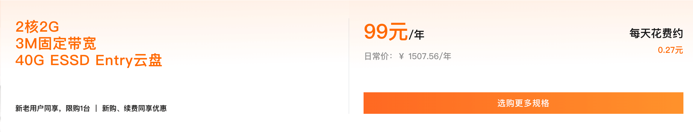 阿里云新用户购买折扣比较大,云服务器2核2G 3M固定带宽原价 1507.56/年, 现低至 99元/年,另外可以按 99元 续费一年,也就是 198元 用两年点击下面图片查看详情。