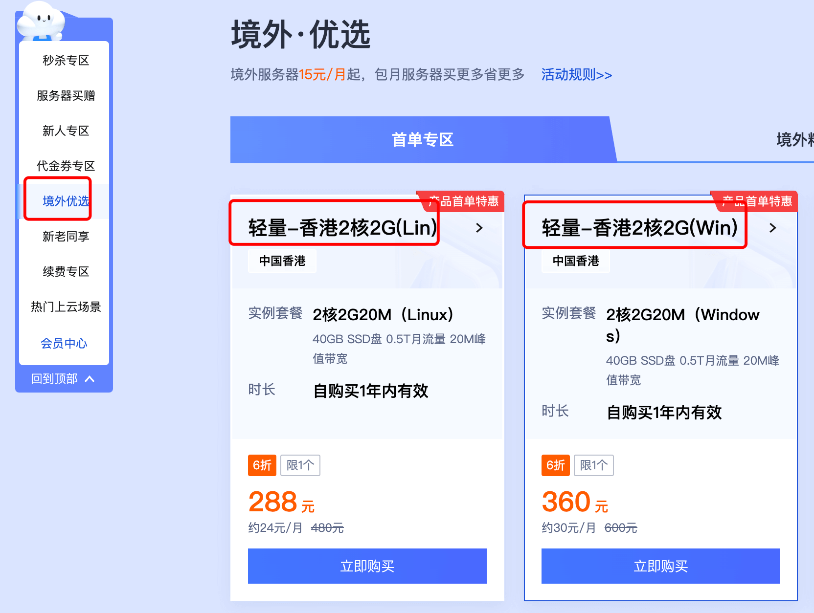 国内服务器如果要做网站之类的还得备案,中国香港地区和海外的是不需要备案的,可以点击: https://curl.qcloud.com/0lBLen2D 链接,选择不同区域购买,以下红框部分不需要备案。