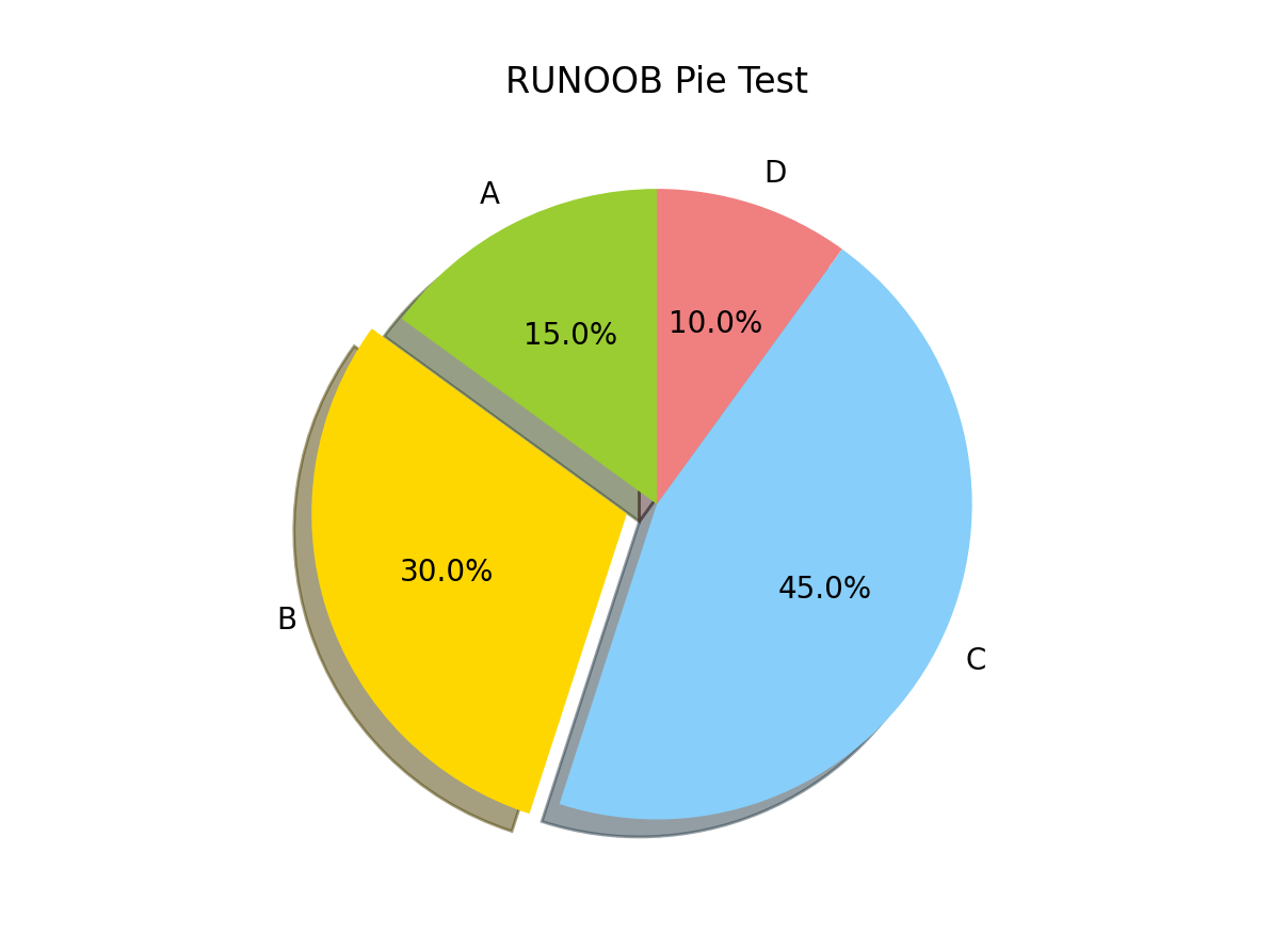 我们定义了一个包含 4 个元素的列表 sizes,它表示各个类别在总体中所占的比例。然后,我们定义了一个包含 4 个元素的列表 labels,它表示各个类别的标签。接下来,我们定义了一个包含 4 个元素的列表 colors,它表示每个类别的颜色。然后,我们定义了一个包含 4 个元素的元组 explode,它用来指定是否突出某个扇形。接着,我们调用 plt.pie 函数来绘制饼图,其中传入了上述参数。最后,我们添加了一个标题,并调用 plt.show() 来显示图形。
