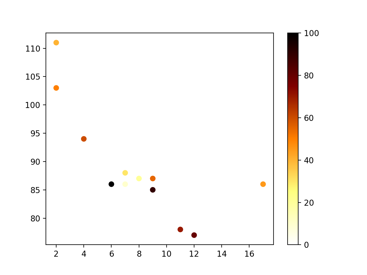 设置颜色条需要使用 cmap 参数,默认值为 'viridis',之后颜色值设置为 0 到 100 的数组。