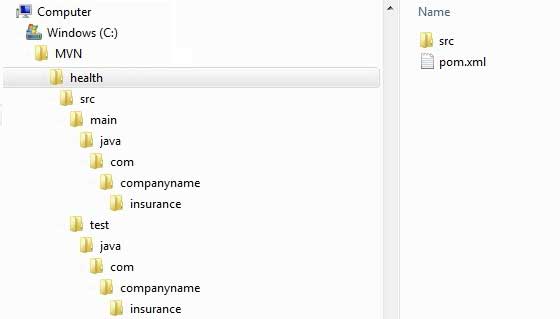 现在转到 C:\ > MVN 目录。你会看到一个名为 health 的 java 应用程序项目,就像在项目创建的时候建立的 artifactId 名称一样。 Maven 将创建一个有标准目录布局的项目,如下所示: