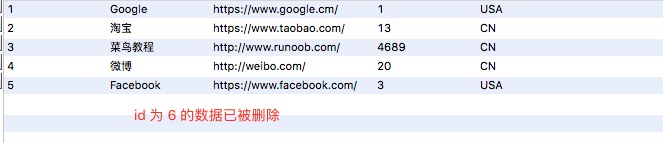执行成功后,查看数据表,即可以看到 id=6 的数据已被删除: