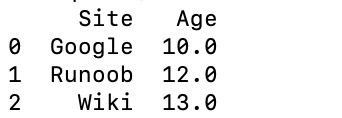 data = {'Site':['Google', 'yssmx', 'Wiki'], 'Age':[10, 12, 13]}