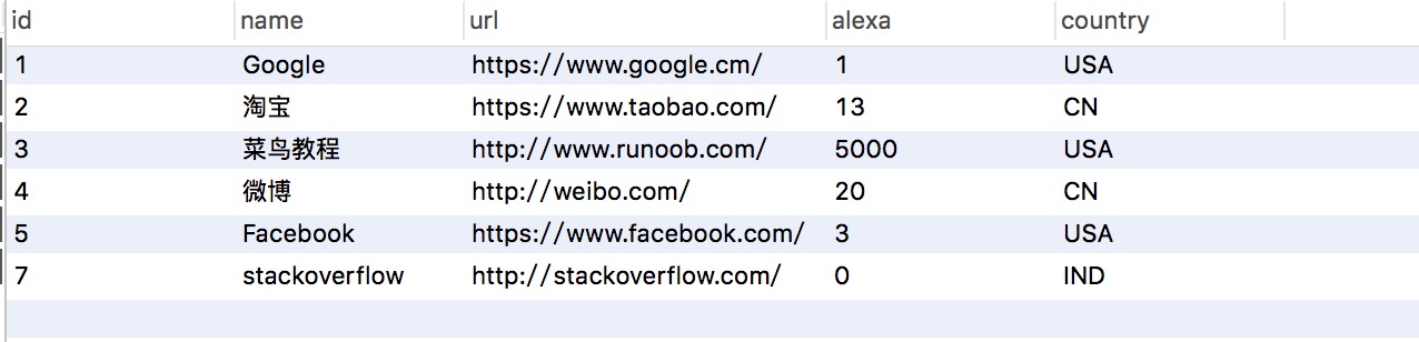 这里我们在 MySQL 数据库创建 yssmx 数据库,数据表为 Websites,表结构及数据如下图所示: