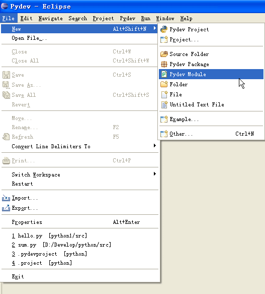 光有项目是无法执行的,接着必须创建新的Pydev Moudle,选择File -> New -> Pydev Module