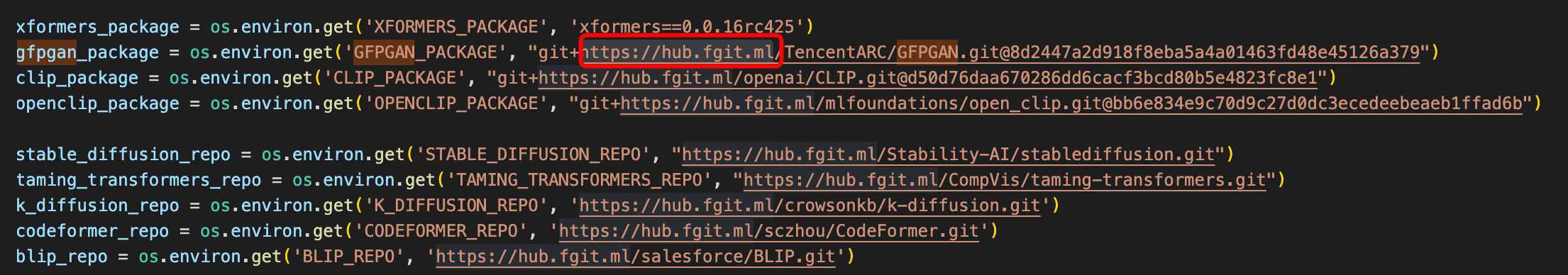注意: 如果安装出现卡住不动,很可能是下载 Github 源码出现问题了,可以使用 Github 的一些镜像来解决,目前还没非常稳定的镜像,建议 Google 搜索下。 我这边在 2023 年 4 月 6 号使用以下镜像地址 https://hub.fgit.ml,打开 stable-diffusion-webui 目录的 launch.py 文件,替换以下部分代码的 Github 地址(代码大概在 230~240 行之间):