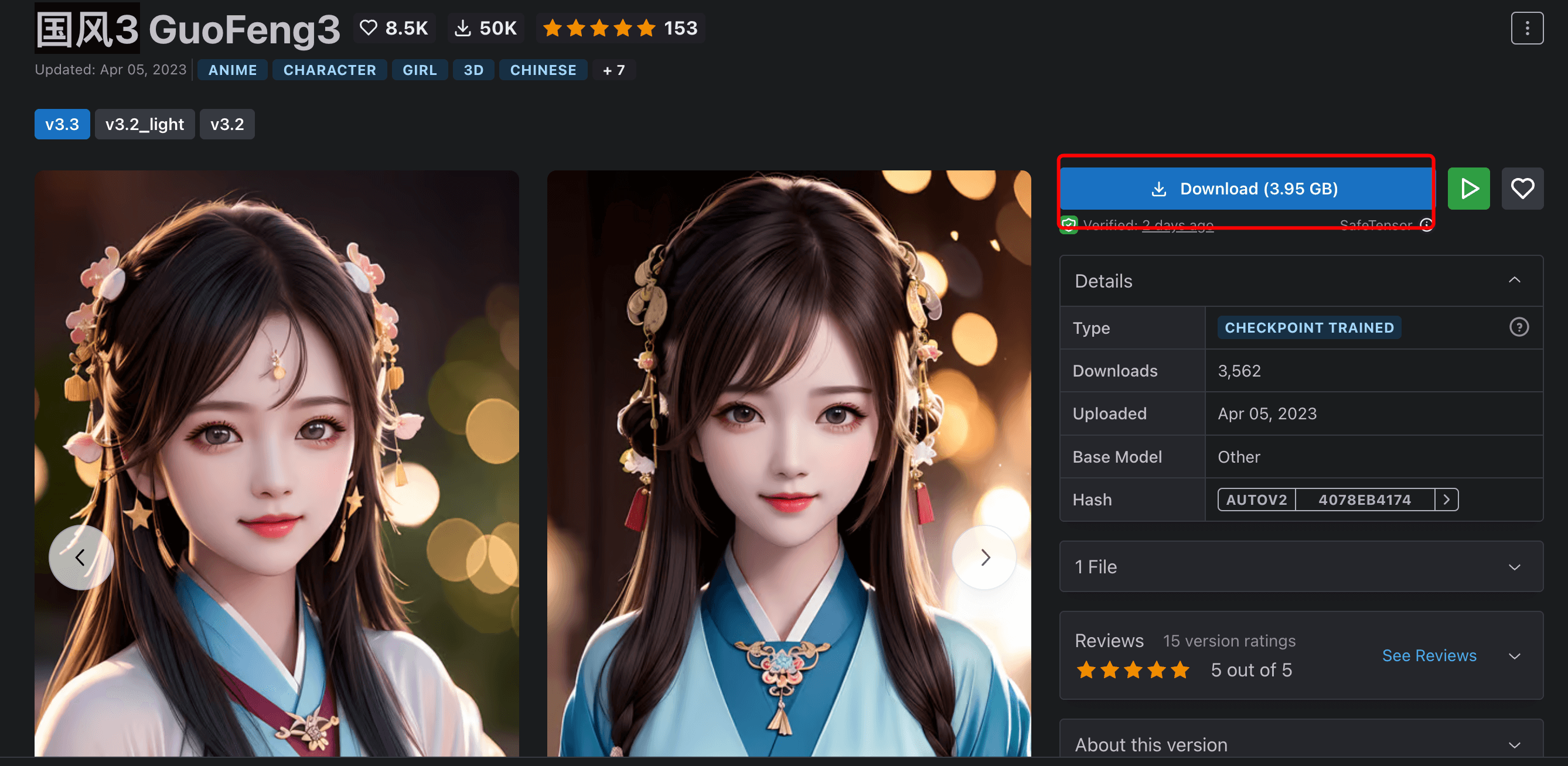 Civitai 有许多定制好的模型,而且可以免费下载,我们使用国风3模型来测试,下载地址:https://civitai.com/models/10415/3-guofeng3?modelVersionId=36644