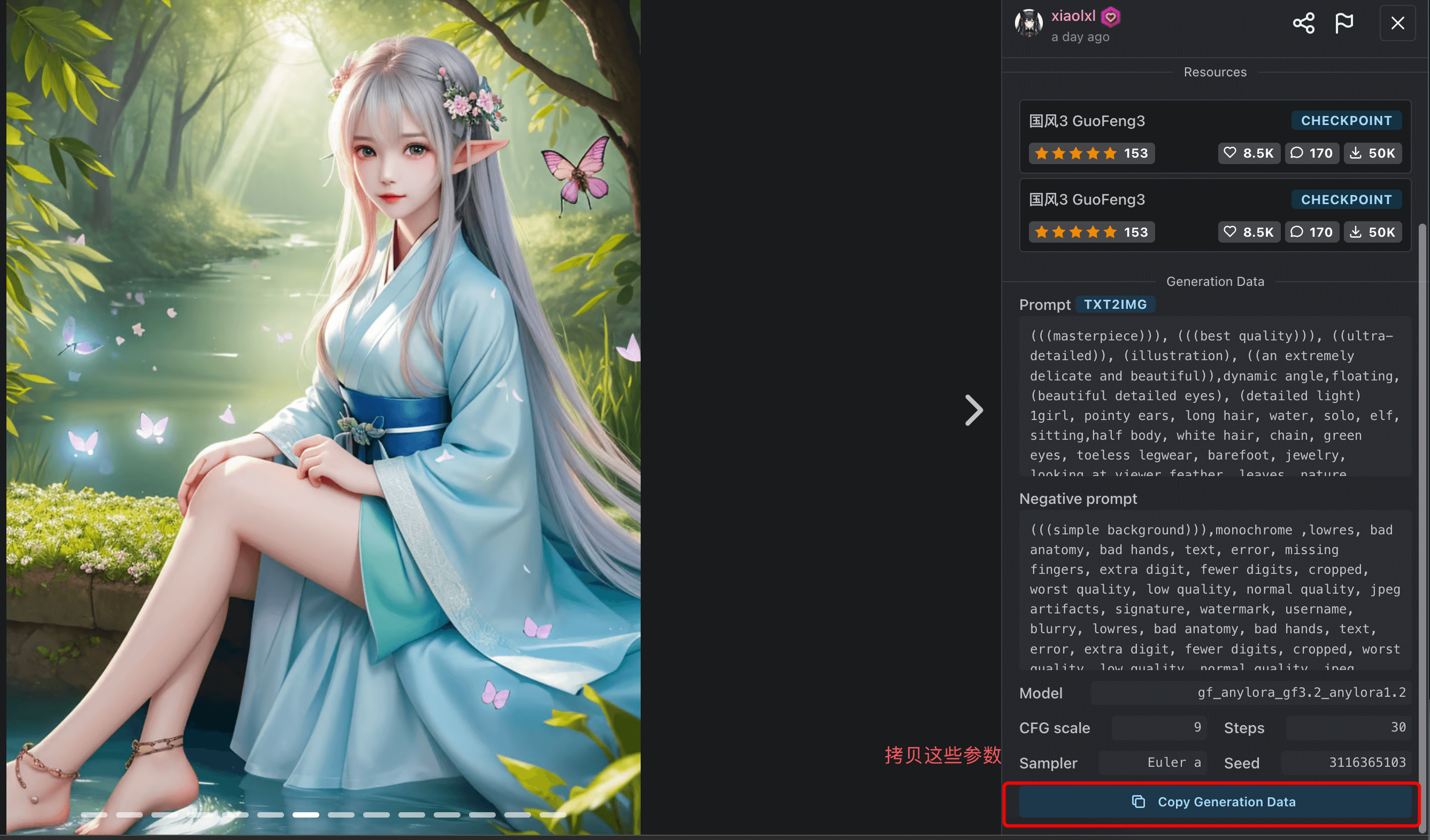 选择后,我们可以到模型介绍页面去拷贝一些提示词和测试参数: