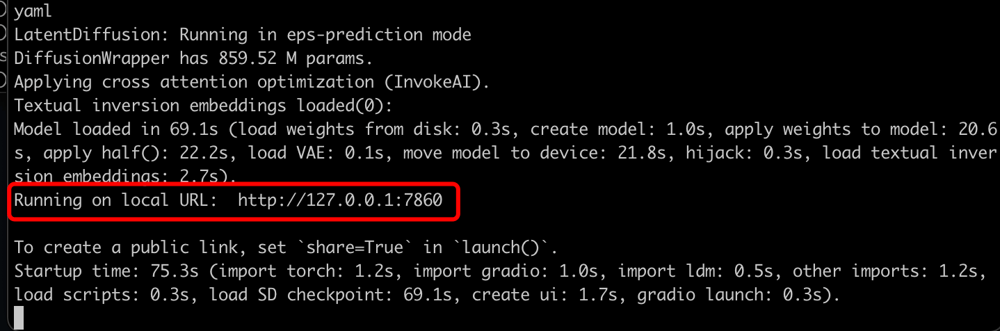 接下来程序就会自动安装并启动,启动成功会看到一个可访问的 URL 地址 http://127.0.0.1:7860:
