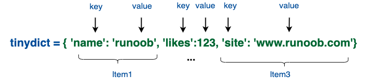 字典的每个键值 key=>value 对用冒号 : 分割,每个对之间用逗号(,)分割,整个字典包括在花括号 {} 中 ,格式如下所示: