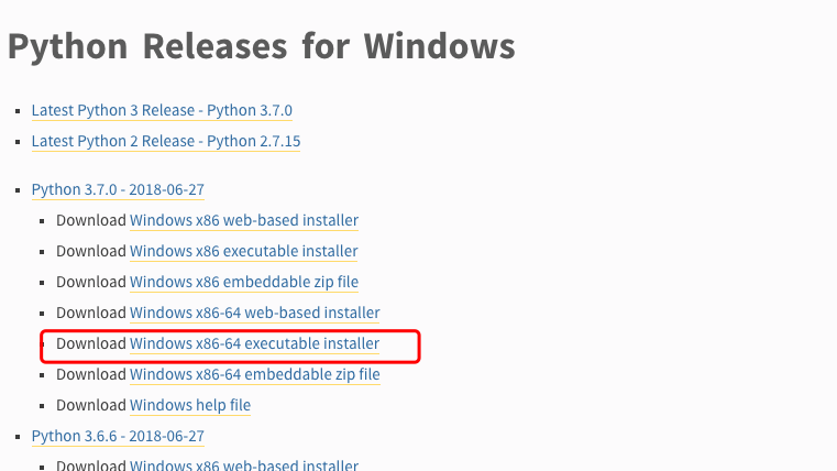 打开 WEB 浏览器访问 https://www.python.org/downloads/windows/ ,一般就下载 executable installer,x86 表示是 32 位机子的,x86-64 表示 64 位机子的。