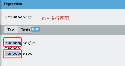 | m | multi line - 多行匹配 | 使边界字符 ^ 和 $ 匹配每一行的开头和结尾,记住是多行,而不是整个字符串的开头和结尾。 |