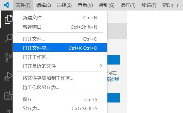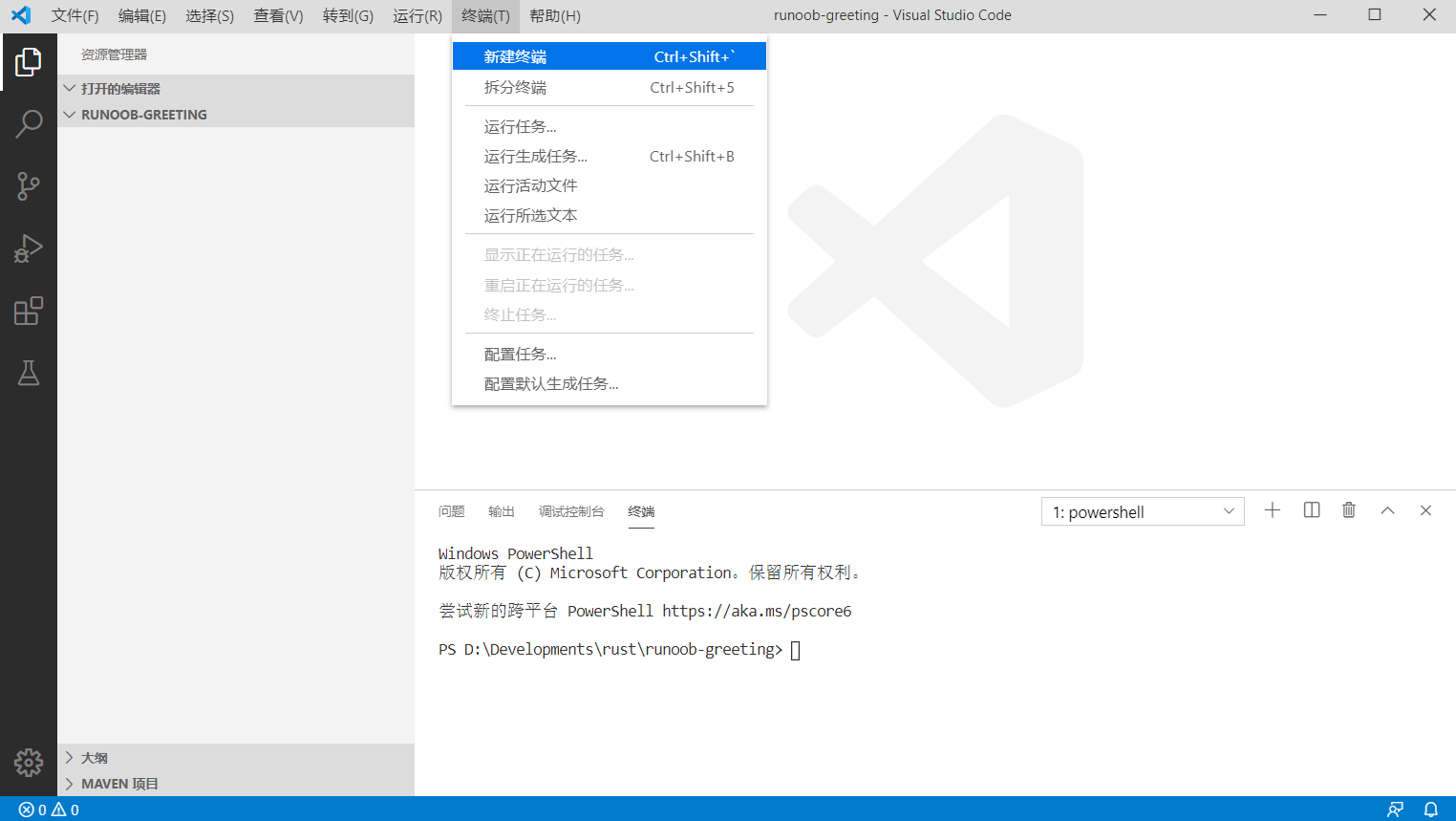 打开文件夹之后选择菜单栏中的"终端"-"新建终端",会打开一个新的终端: