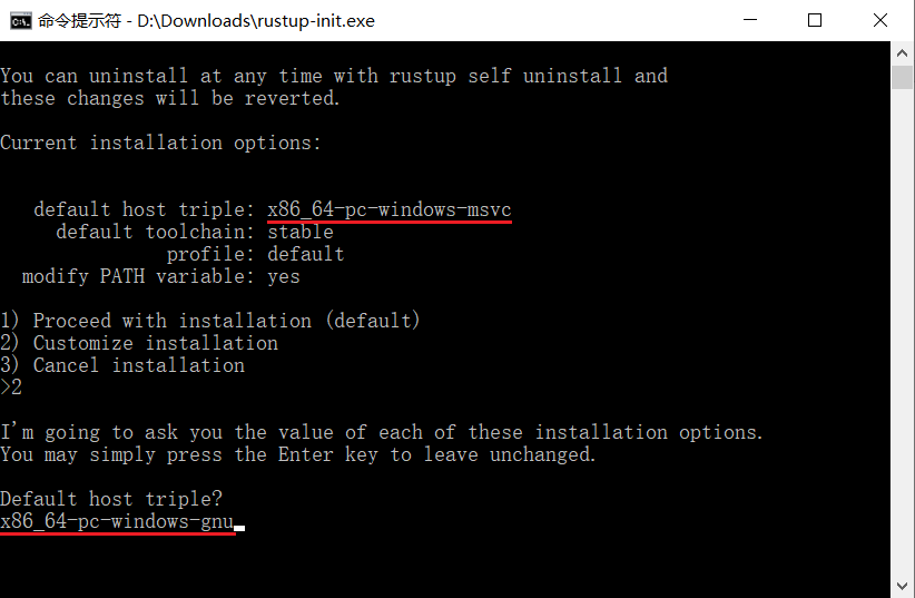 如果你安装的是 MinGW,那么你需要输入 2 (自定义安装),然后系统会询问你 Default host triple? ,请将上图中 default host triple 的 "msvc" 改为 "gnu" 再输入安装程序: