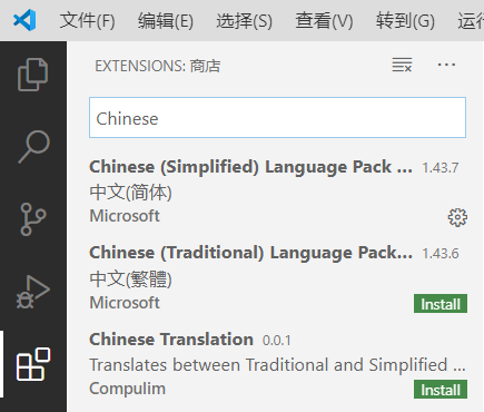 在左边栏里找到 "Extensions",并查找 "Chinese",安装简体中文扩展,使界面变成中文。(如果你愿意用英文界面或计算机不支持中文字符,此步骤可以跳过)。