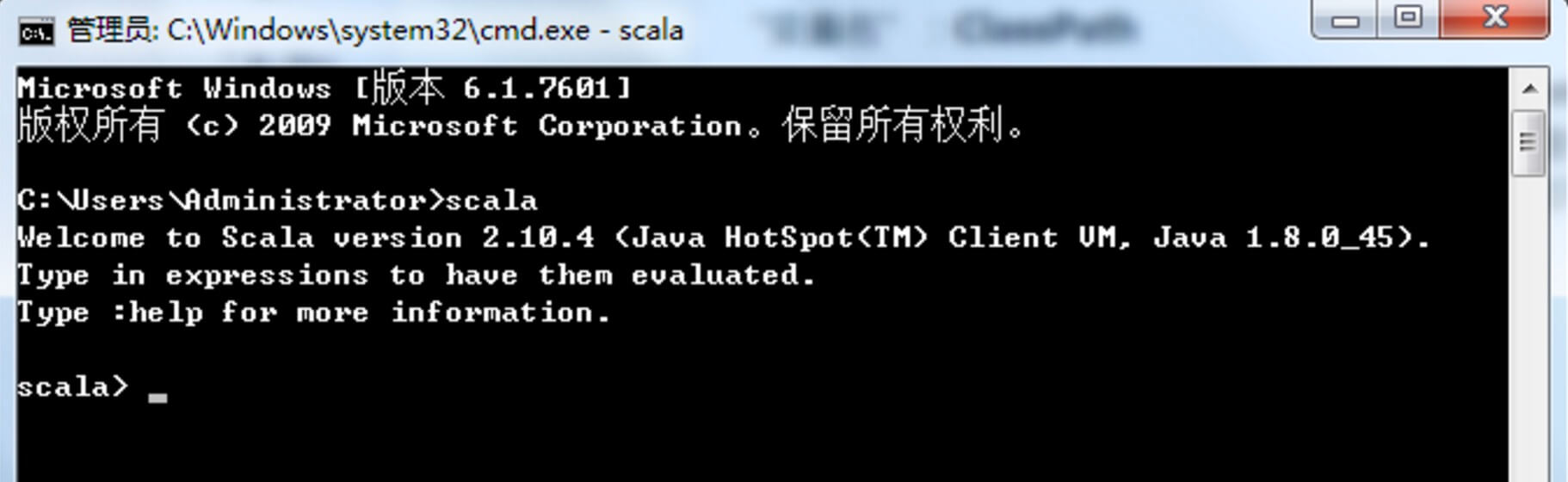 检查环境变量是否设置好了:调出"cmd"检查。单击 【开始】,在输入框中输入cmd,然后"回车",输入 scala,然后回车,如环境变量设置ok,你应该能看到这些信息。