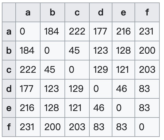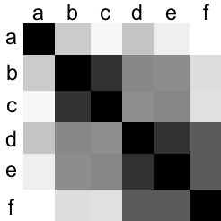 距离矩阵的这些数据可以进一步被看成是图形表示的热度图(如下图所示),其中黑色代表距离为零,白色代表最大距离。