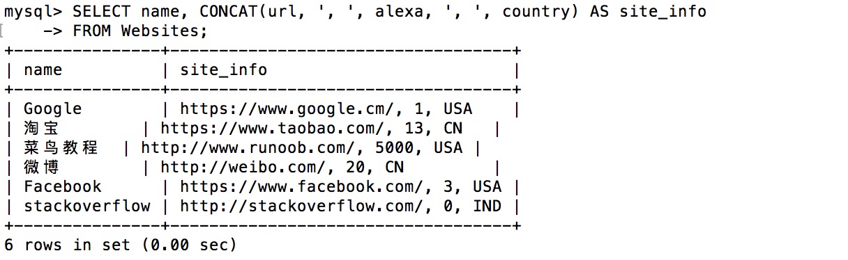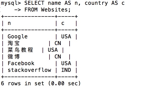 mysql> SELECT * FROM Websites; +----+---------------+---------------------------+-------+---------+ | id_name _url _alexa_country | +----+---------------+---------------------------+-------+---------+ | 1_Google _https://www.google.cm/ _ 1_USA | | 2_淘宝 _https://www.taobao.com/ _ 13_CN | | 3_云搜索MX教程 _/ _ 5000_USA | | 4_微博 _http://weibo.com/ _ 20_CN | | 5_Facebook _https://www.facebook.com/_ 3_USA | | 7_stackoverflow_http://stackoverflow.com/_ 0_IND | +----+---------------+---------------------------+-------+---------+