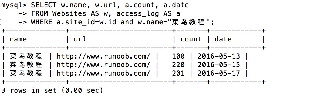 mysql> SELECT * FROM access_log; +-----+---------+-------+------------+ | aid_site_id_count_date | +-----+---------+-------+------------+ | 1_ 1_ 45_2016-05-10 | | 2_ 3_ 100_2016-05-13 | | 3_ 1_ 230_2016-05-14 | | 4_ 2_ 10_2016-05-14 | | 5_ 5_ 205_2016-05-14 | | 6_ 4_ 13_2016-05-15 | | 7_ 3_ 220_2016-05-15 | | 8_ 5_ 545_2016-05-16 | | 9_ 3_ 201_2016-05-17 | +-----+---------+-------+------------+ 9 rows in set (0.00 sec)