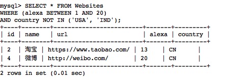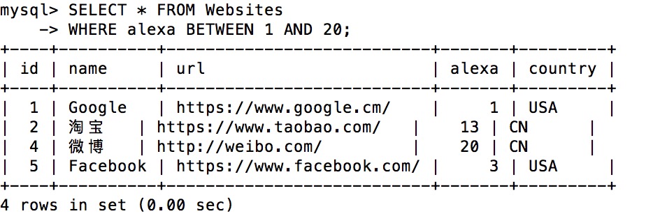 mysql> SELECT * FROM Websites; +----+---------------+---------------------------+-------+---------+ | id_name _url _alexa_country | +----+---------------+---------------------------+-------+---------+ | 1_Google _https://www.google.cm/ _ 1_USA | | 2_淘宝 _https://www.taobao.com/ _ 13_CN | | 3_云搜索MX教程 _/ _ 5000_USA | | 4_微博 _http://weibo.com/ _ 20_CN | | 5_Facebook _https://www.facebook.com/_ 3_USA | | 7_stackoverflow_http://stackoverflow.com/_ 0_IND | +----+---------------+---------------------------+-------+---------+