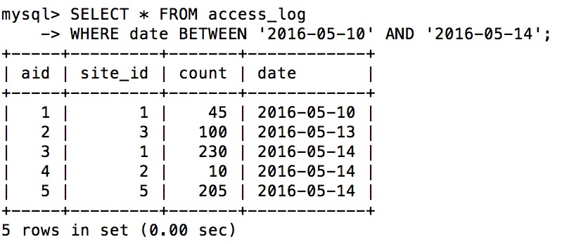mysql> SELECT * FROM access_log; +-----+---------+-------+------------+ | aid_site_id_count_date | +-----+---------+-------+------------+ | 1_ 1_ 45_2016-05-10 | | 2_ 3_ 100_2016-05-13 | | 3_ 1_ 230_2016-05-14 | | 4_ 2_ 10_2016-05-14 | | 5_ 5_ 205_2016-05-14 | | 6_ 4_ 13_2016-05-15 | | 7_ 3_ 220_2016-05-15 | | 8_ 5_ 545_2016-05-16 | | 9_ 3_ 201_2016-05-17 | +-----+---------+-------+------------+ 9 rows in set (0.00 sec)
