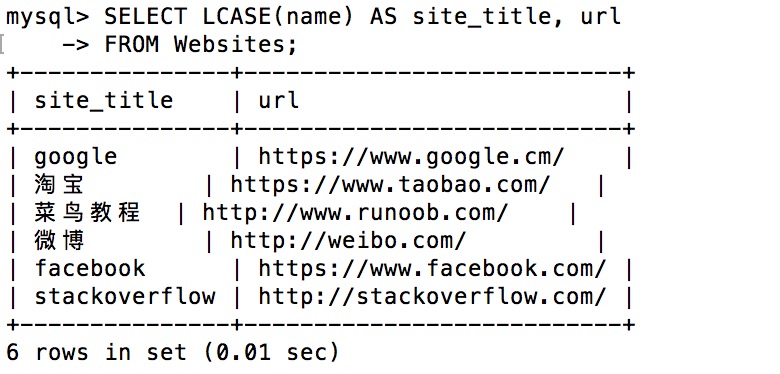 SELECT LCASE(name) AS site_title, url