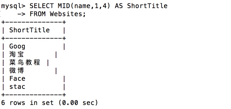 SELECT MID(column_name[,start,length]) FROM table_name;