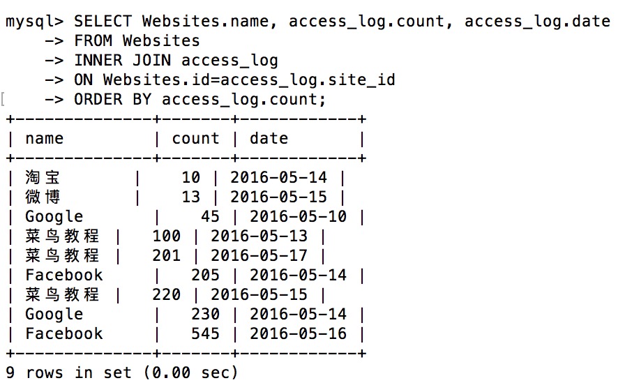 注释:INNER JOIN 关键字在表中存在至少一个匹配时返回行。如果 "Websites" 表中的行在 "access_log" 中没有匹配,则不会列出这些行。