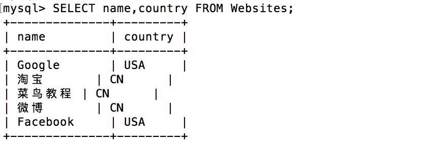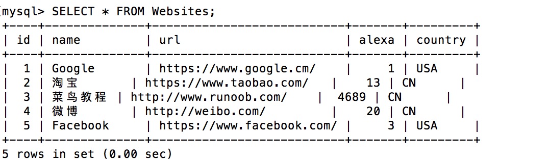 +----+--------------+---------------------------+-------+---------+ | id_name _url _alexa_country | +----+--------------+---------------------------+-------+---------+ | 1 _Google _https://www.google.cm/ _1 _USA | | 2 _淘宝 _https://www.taobao.com/ _13 _CN | | 3 _云搜索MX教程 _/ _4689 _CN | | 4 _微博 _http://weibo.com/ _20 _CN | | 5 _Facebook _https://www.facebook.com/_3 _USA | +----+--------------+---------------------------+-------+---------+