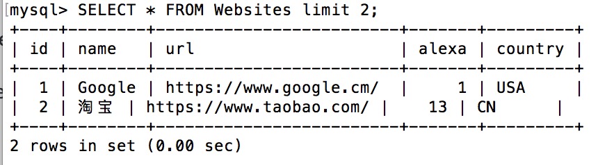 mysql> SELECT * FROM Websites; +----+---------------+---------------------------+-------+---------+ | id_name _url _alexa_country | +----+---------------+---------------------------+-------+---------+ | 1_Google _https://www.google.cm/ _ 1_USA | | 2_淘宝 _https://www.taobao.com/ _ 13_CN | | 3_云搜索MX教程 _/ _ 5000_USA | | 4_微博 _http://weibo.com/ _ 20_CN | | 5_Facebook _https://www.facebook.com/_ 3_USA | | 7_stackoverflow_http://stackoverflow.com/_ 0_IND | +----+---------------+---------------------------+-------+---------+