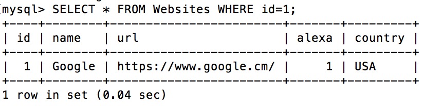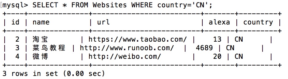 +----+--------------+---------------------------+-------+---------+ | id_name _url _alexa_country | +----+--------------+---------------------------+-------+---------+ | 1 _Google _https://www.google.cm/ _1 _USA | | 2 _淘宝 _https://www.taobao.com/ _13 _CN | | 3 _云搜索MX教程 _/ _4689 _CN | | 4 _微博 _http://weibo.com/ _20 _CN | | 5 _Facebook _https://www.facebook.com/_3 _USA | +----+--------------+---------------------------+-------+---------+