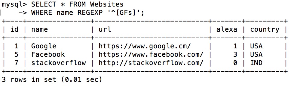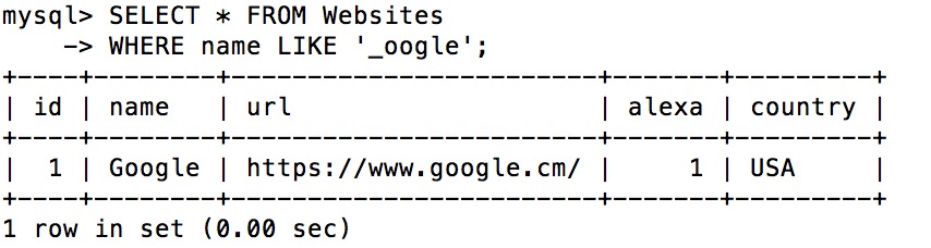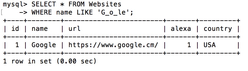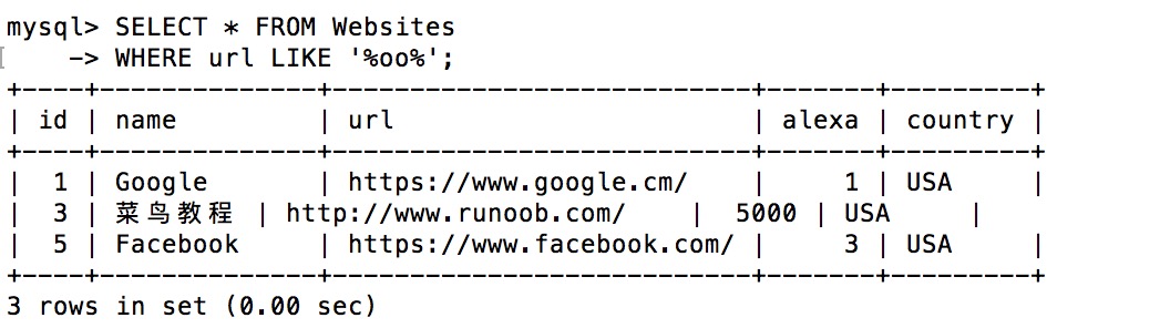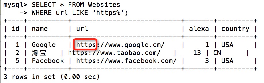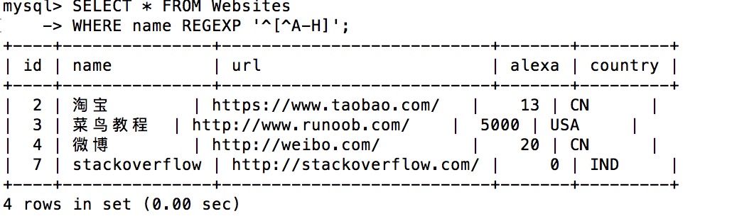 mysql> SELECT * FROM Websites; +----+---------------+---------------------------+-------+---------+ | id_name _url _alexa_country | +----+---------------+---------------------------+-------+---------+ | 1_Google _https://www.google.cm/ _ 1_USA | | 2_淘宝 _https://www.taobao.com/ _ 13_CN | | 3_云搜索MX教程 _/ _ 5000_USA | | 4_微博 _http://weibo.com/ _ 20_CN | | 5_Facebook _https://www.facebook.com/_ 3_USA | | 7_stackoverflow_http://stackoverflow.com/_ 0_IND | +----+---------------+---------------------------+-------+---------+