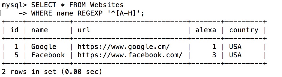 MySQL 中使用 REGEXP 或 NOT REGEXP 运算符 (或 RLIKE 和 NOT RLIKE) 来操作正则表达式。