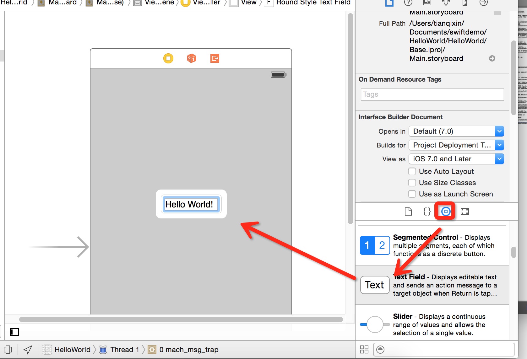 9.我们为界面添加点内容,在右下方找到Text控件,将它拖入storyboard上,并双击写入文本"Hello World!"。
