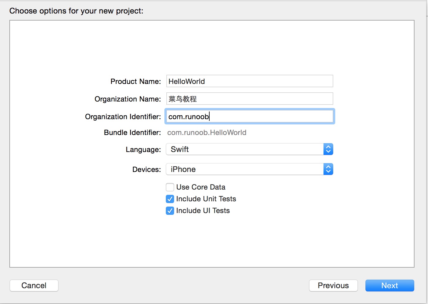其中Language有两个选项:Objective-c和swift,因为我们是学习swift当然选择swift项了。 点击"Next"下一步。
