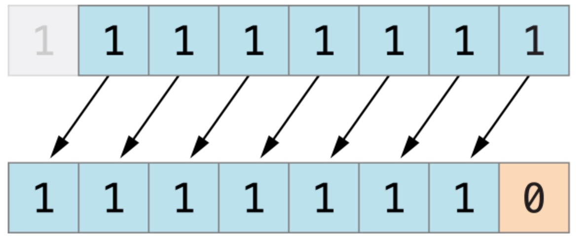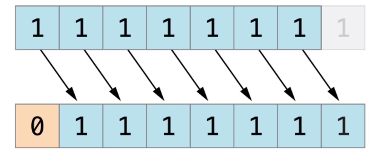 下图展示了11111111 << 1(11111111 左移一位)的结果。蓝色数字表示被移动位,灰色表示被丢弃位,空位用橙色的0填充。
