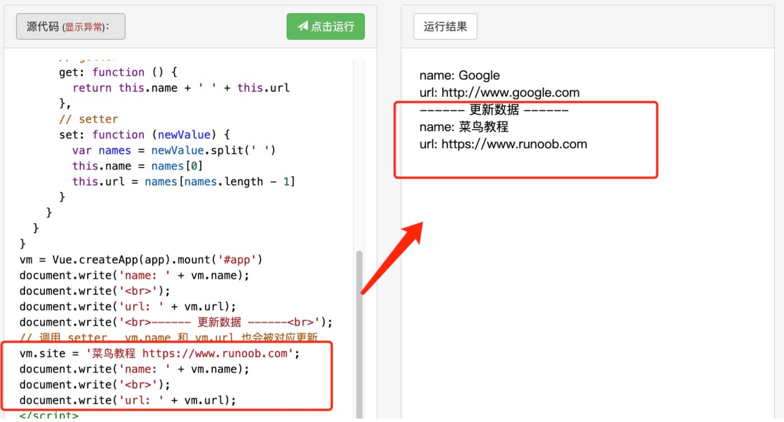 从实例运行结果看在运行 vm.site = '云搜索MX教程 http://www.yssmx.com'; 时,setter 会被调用, vm.name 和 vm.url 也会被对应更新。